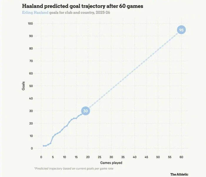 TA足球官方预测,哈兰德凭借迅猛速度与强壮体格,无论地面还是空中都几乎难以阻挡,若保持当前进球效率,哈兰德本赛季60场比赛有望达成95球的惊人成绩。