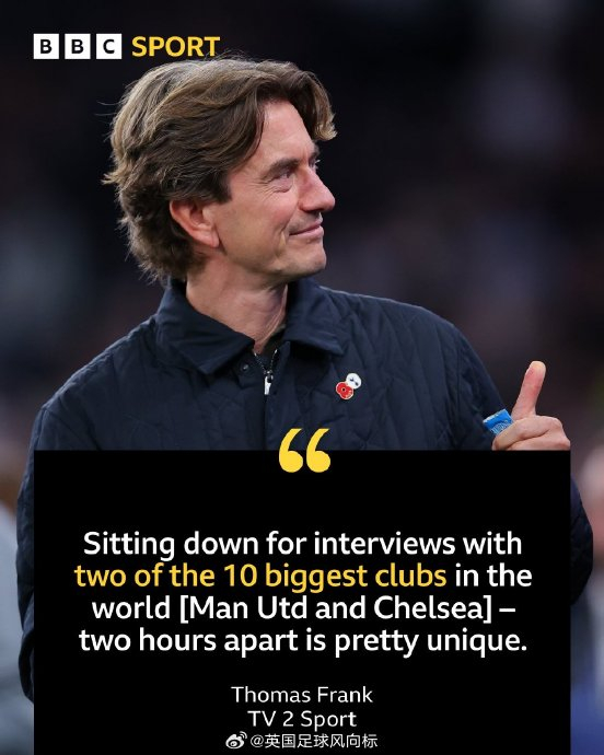 【弗兰克曾接受曼联切尔西面试】热刺主帅托马斯-弗兰克在接受北欧媒体采访时透露:2024年5月的某一天,他在同一天内先后与#曼联#和#切尔西#两家俱乐部的高层进行会议(面试),当时曼联正在考虑滕哈格的替代人选,切尔西在考虑波切蒂诺的替代人选,两场会议之间只相隔了2小时。
