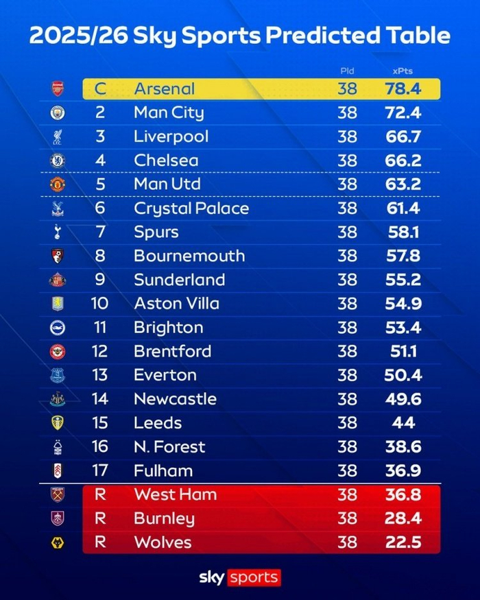 天空体育预测了本赛季英超联赛的最终排名,阿森纳夺冠。