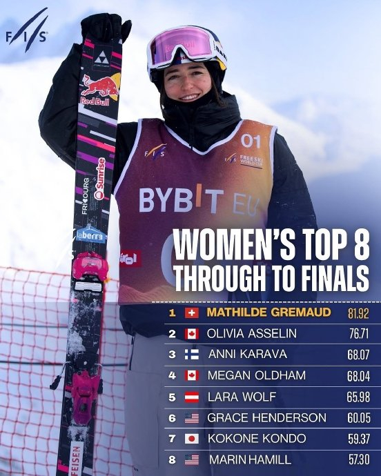 #2025自由式滑雪世界杯##自由式滑雪坡面障碍技巧# 女子资格赛回顾,本组晋级选手:🇨🇭玛蒂尔德·格雷莫德、🇨🇦奥利维亚·阿塞林、🇫🇮安妮卡·拉瓦、🇨🇦梅根·奥尔德姆 、🇦🇹拉拉·沃尔夫 、🇺🇸格雷斯·亨德森 、🇯🇵近藤小野、🇺🇸马林·哈米尔。