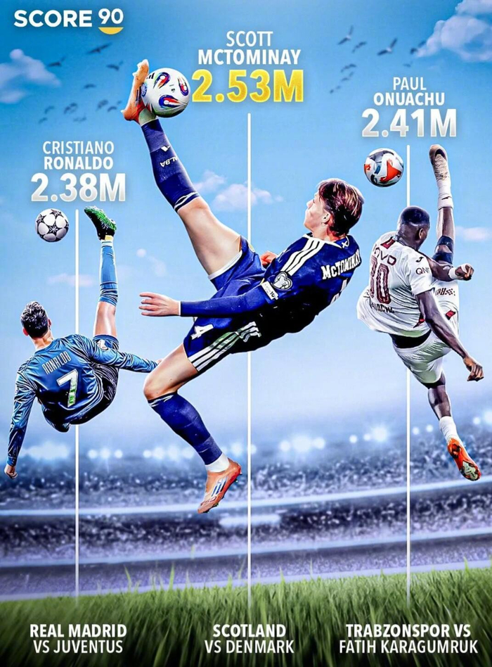 Score90报道,麦克托米奈在世预赛苏格兰4-2击败丹麦比赛中的倒钩射门创造了新的世界纪录,成为有史以来最高的倒钩进球。