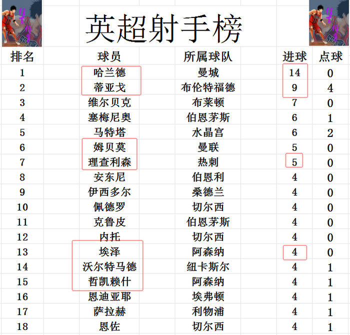 射手榜方面,哈兰德14球领跑,蒂亚戈9球排在第2,维尔贝克7球位列第3。理查利森今天打入一记精彩的吊射后,追上姆贝莫,两人5球并列第6。埃泽上演帽子戏法,追上萨拉赫,哲凯赖什等人4球刚好挤入前十。