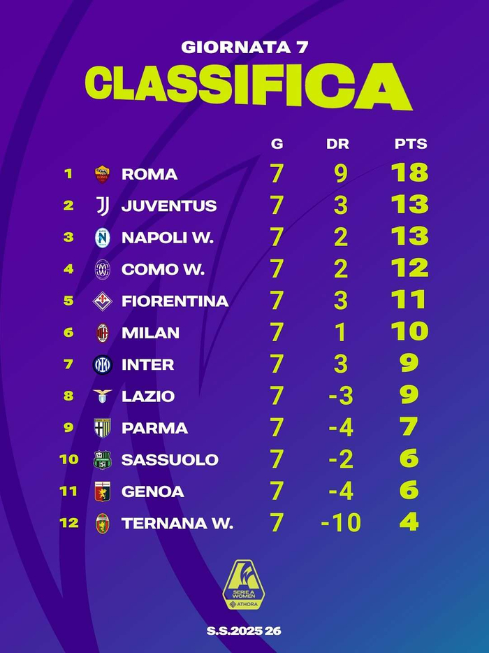 【女足积分榜】 2025-26赛季#意甲# 女足联赛第七轮积分榜。💪🏻#sempremilan#