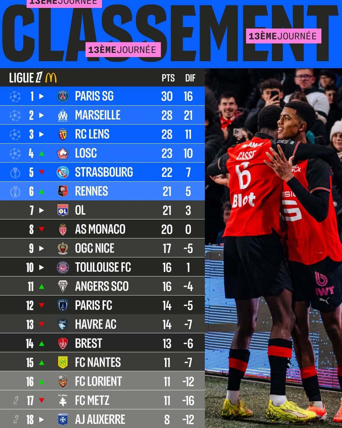 【法甲积分榜】 #法甲# 2025-26赛季法甲联赛第13轮积分榜。👿