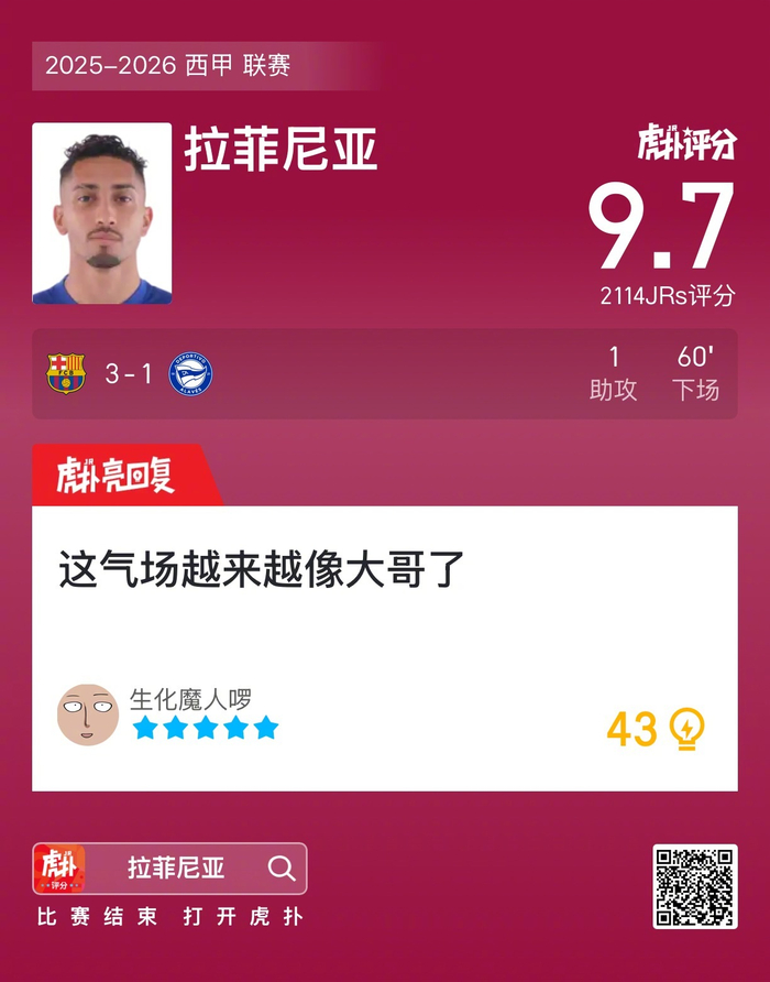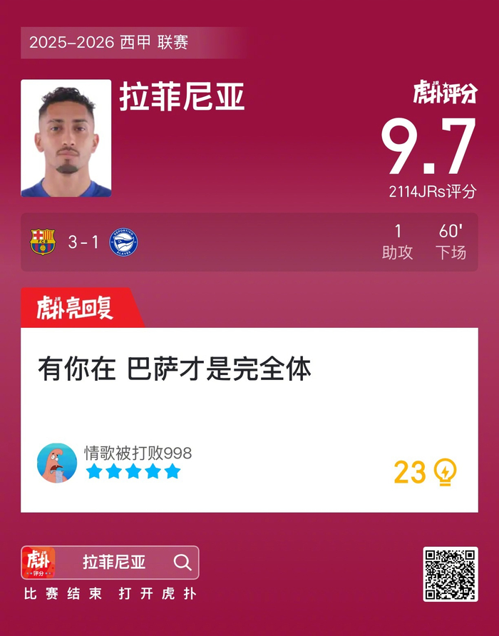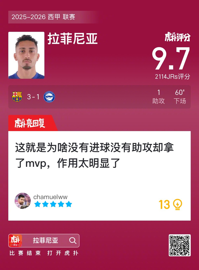 #巴萨3比1阿拉维斯# 拉菲尼亚贡献一次助攻,赛后收获9.7的虎扑评分!