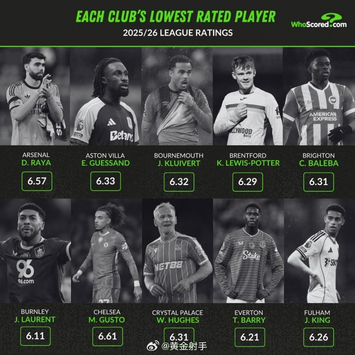 本赛季英超各队场均评分最低球员(至少出场400分钟):