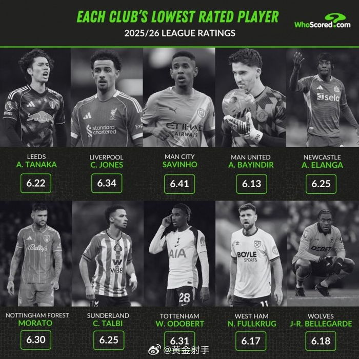 #曼城[超话]# WhoScored列出了本赛季英超各队场均评分最低的球员,拉亚、柯蒂斯·琼斯、萨维尼奥在列。