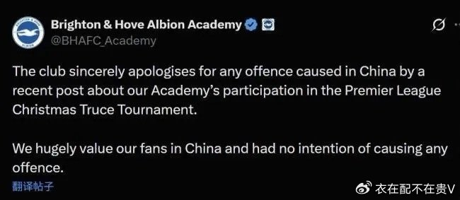 由于二战期间日本曾在中国犯下累累罪行,中国球迷对此非常不满和愤怒,布莱顿俱乐部不得不公开道歉。而据英国媒体报道,布莱顿俱乐部的工作人员表示,这起事件完全是一个失误。俱乐部和英超联赛此前并不知晓这个“争议”,也不了解参与此事的具体人员。