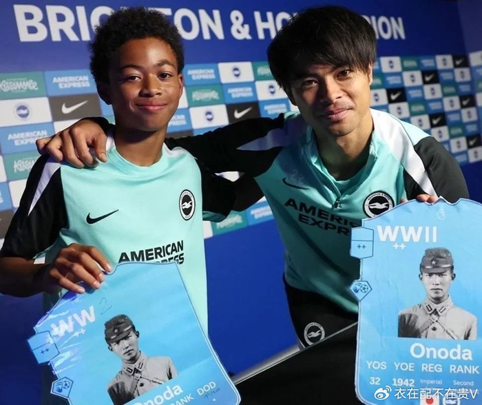 英超布莱顿俱乐部的青训学院参加英超圣诞休战活动,发布了日本国脚三笘薰与一名青年球员的合影,二人手持印有二战期间日本战犯小野田宽郎照片的卡片。