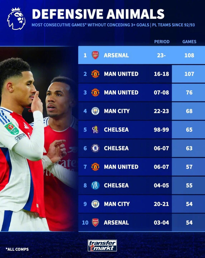 #阿森纳2比0布伦特福德# 赛后,据德转统计,阿森纳也打破了英超球队在所有赛事中单场比赛失球不超过3个的纪录。枪手自2023年以后的108场比赛已经没有在单场比赛中丢过3球,超过了曼联。