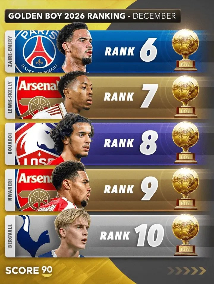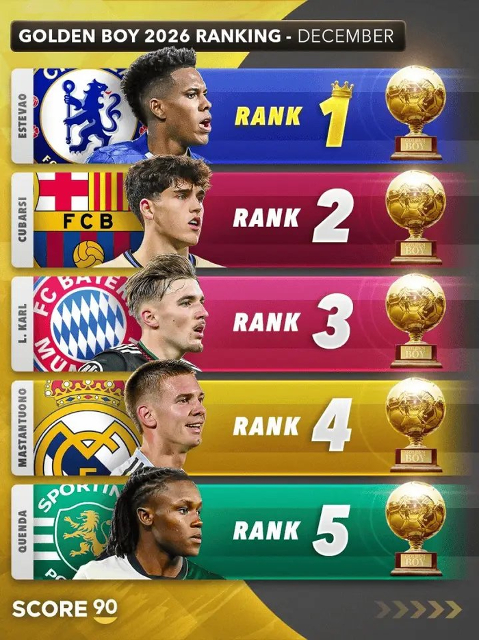 著名媒体Score90列出了2026年金童排名预测,埃斯特旺居首,库巴西、卡尔分列二三。
