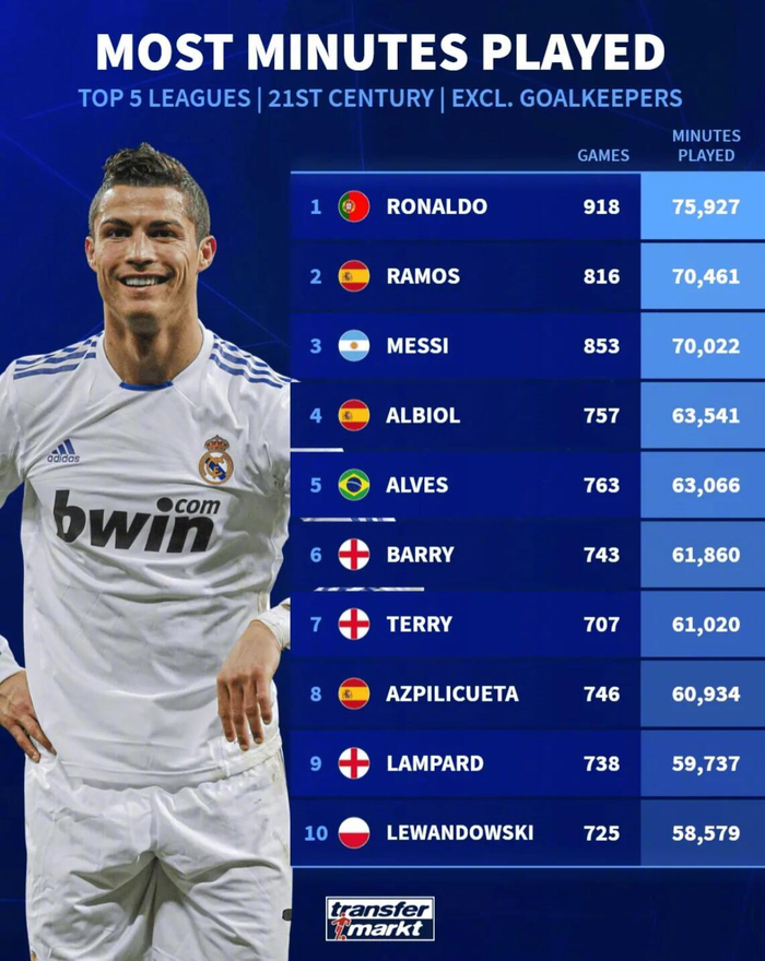 德转数据统计,在21世纪五大联赛非门将球员出场时间榜上,C罗以75,927分钟独占鳌头,领先第二名拉莫斯超过5,400分钟。
