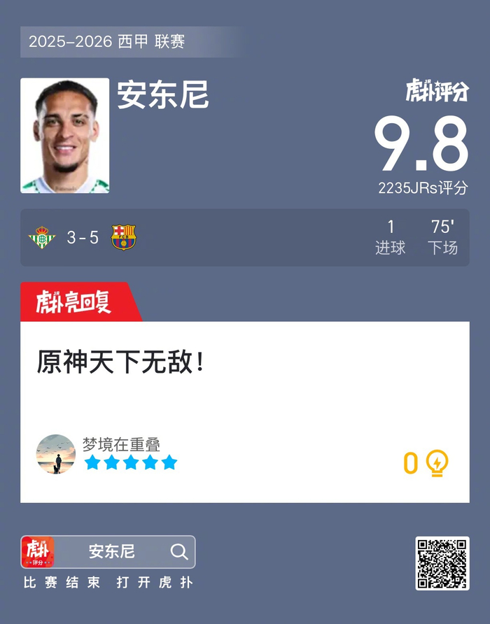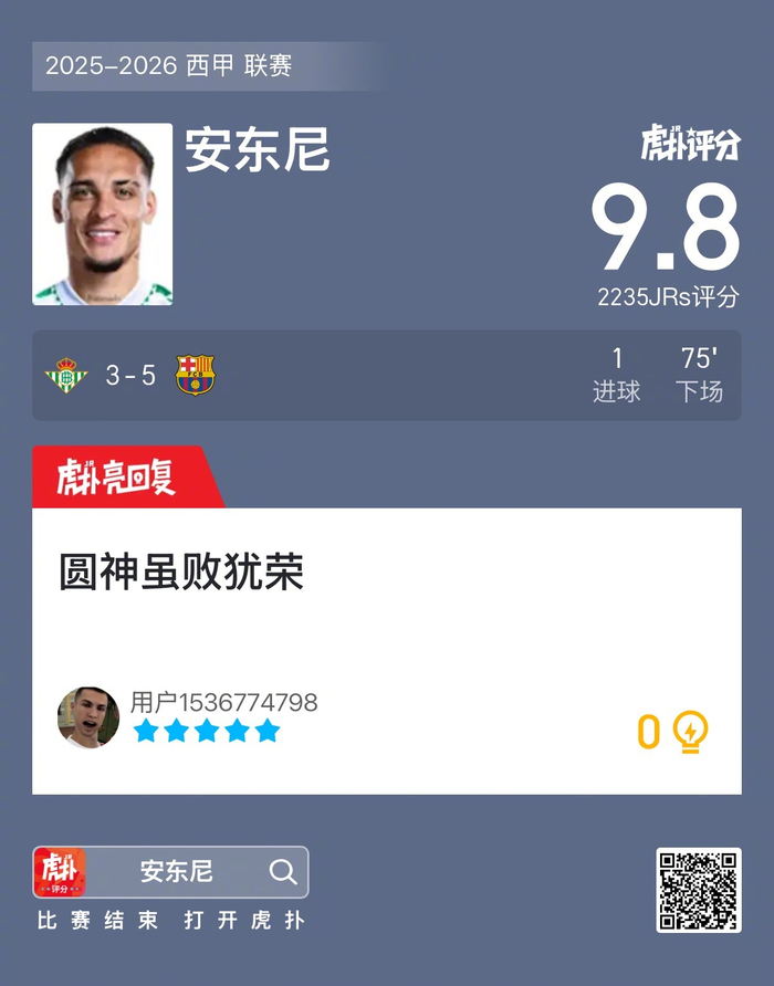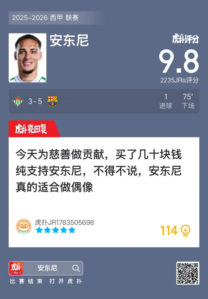 #皇家贝蒂斯3比5巴萨# 安东尼打进一球,赛后收获9.8的虎扑评分!