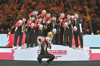 昨晚,在成都举行的2025年国际乒联混合团体世界杯决赛中,中国队以8比1战胜劲旅日本队,以11战全胜的战绩强势卫冕,实现该项赛事三连冠伟业。图为冠军中国队在颁奖仪式上自拍留念。