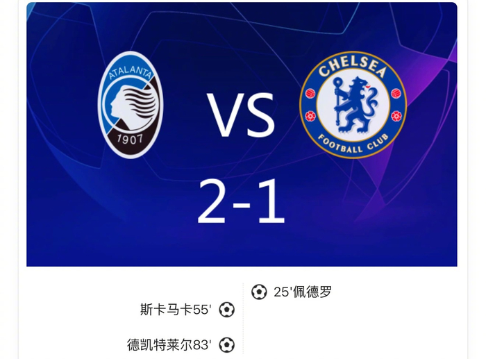 【欧冠:亚特兰大2-1切尔西,佩德罗破门,CDK绝杀】上半场,佩德罗先拔头筹,阿奇姆彭关键封堵。下半场卢克曼进球被吹,斯卡马卡扳平,德凯特莱尔反超。