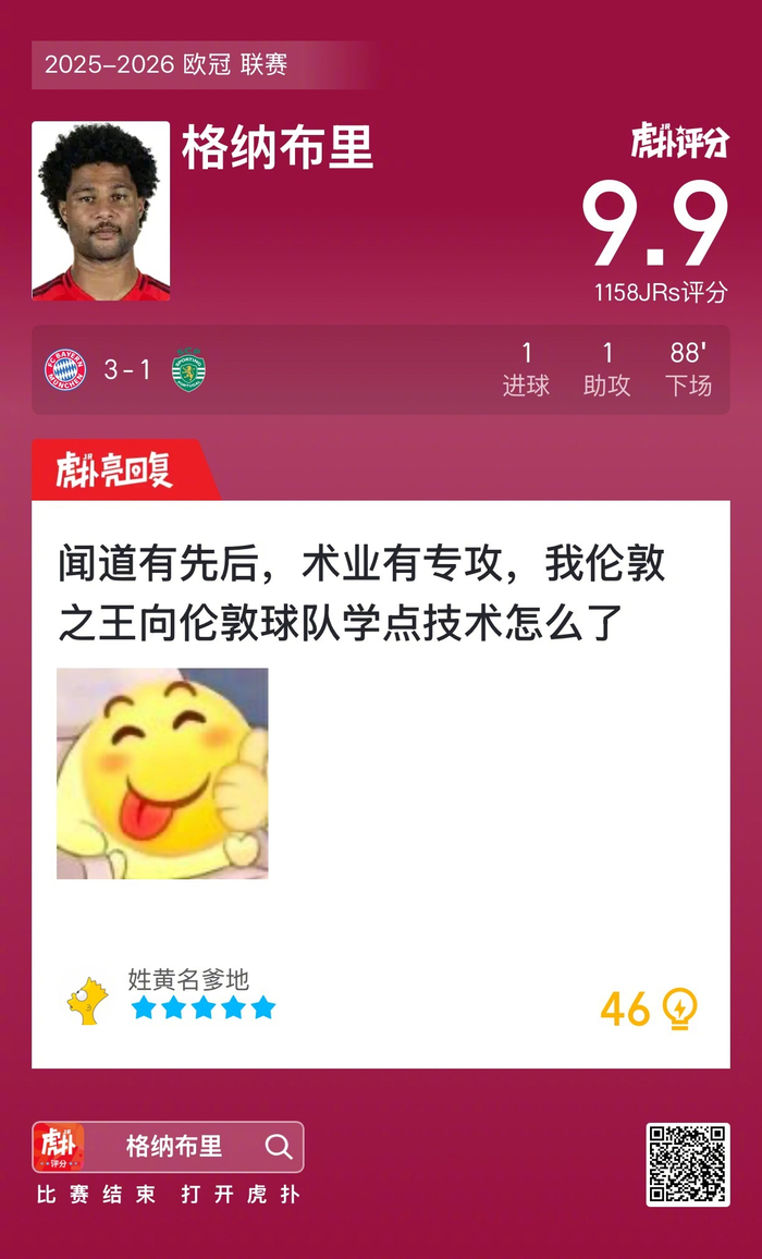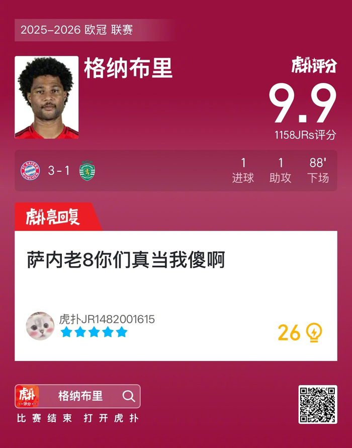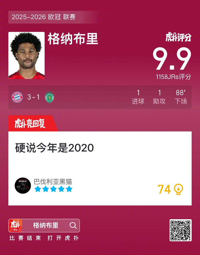#拜仁3比1葡萄牙体育# 格纳布里打进一球贡献一次助攻,赛后收获9.9的虎扑评分!