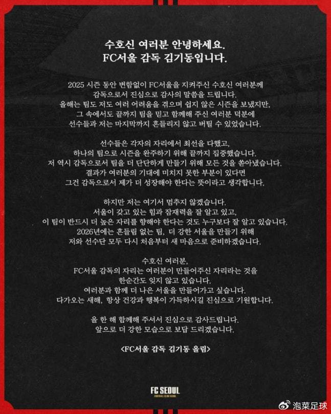 为了表达对俱乐部的感谢,金基东也在今天的感谢信中表达了对下赛季的期望,他说:“我深知首尔所拥有的力量和潜力,也比任何人都清楚这支球队必须向更高的位置迈进。为了在2026年打造一支坚定不移、更加强大的首尔队,我和全体队员都将以全新的心态,从头开始准备。我从未有一刻忘记,FC首尔主教练这个位置是球迷们给予的,我希望与球迷们共同打造一个更好的首尔,未来我将以更强的面貌回报大家。”