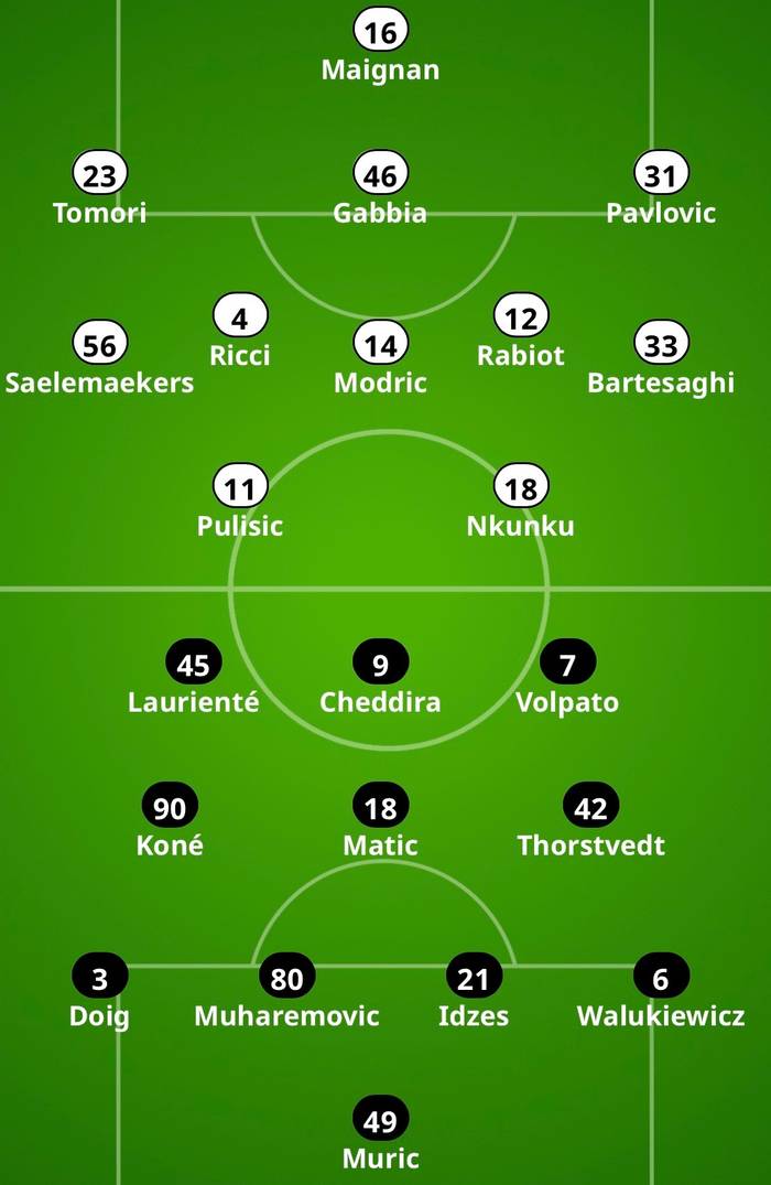 【米体】该媒体给出的2025-26赛季#意甲联赛# 第15轮 -🔴⚫️米兰主场对阵萨索洛队「预计首发阵容」第①版本(352):