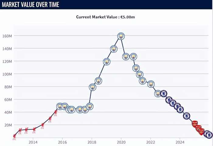 近几年的低迷表现,也让斯特林的身价直线下滑,在比较权威的身价网站《德国转会市场》的最新统计中,斯特林的最新身价已经跌至500万欧元。要知道在斯特林的巅峰期,身价可是达到过1.6亿欧元,那时的他就是最顶级的球员之一,整个世界足坛身价比他更高的球员只有姆巴佩和内马尔。但是在短短6年后,他的身价就足足缩水了32倍,从万人追捧的明星,变成了无球可踢的弃子。
