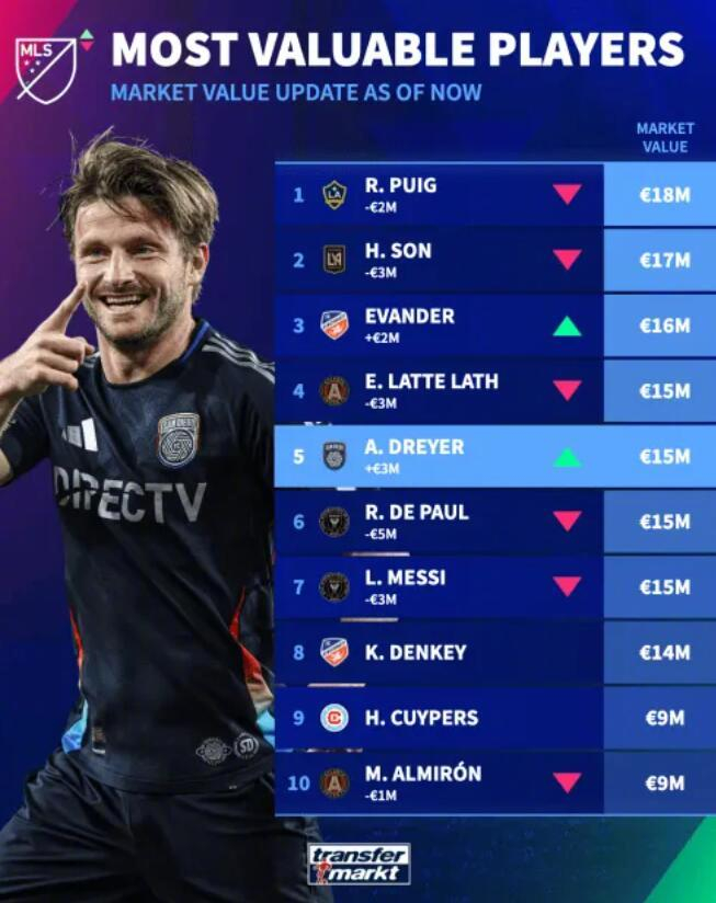 德转更新美职联球员身价,以下是更新后的球员身价前十名榜单以及身价变动情况。