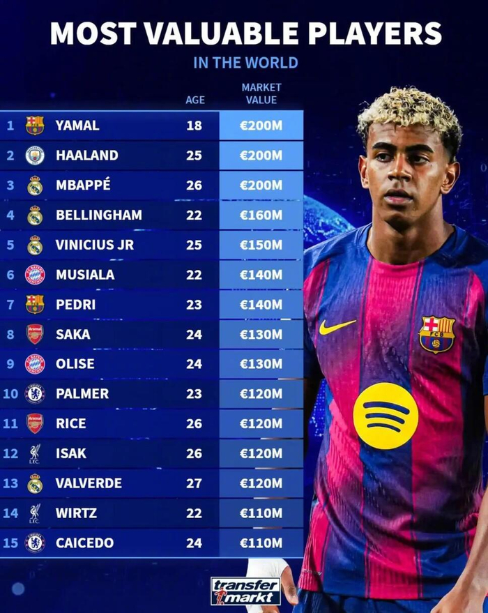 德国转会市场盘点了当前足坛身价排名前15的球星,详情如下:
