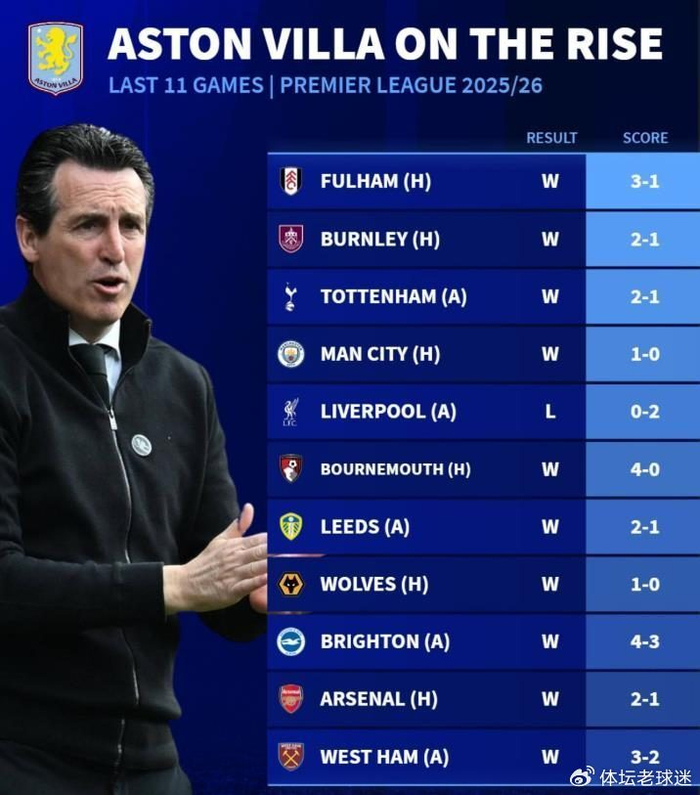 如今维拉与赛季之初,可以说是有着天壤之别。本赛季初,维拉那时正深陷5轮不胜(3平2负)的泥沼,一胜难求的维拉,当时在英超降级区里苦苦挣扎。如今,11轮联赛过后,维拉已经从降级区一路扶摇直上,来到了英超争冠区。为了所有这一切蜕变,都无法绕开一个人,那就是主帅埃梅里。这位曾被誉为“欧联之王”的战术大师,在维拉公园施展了神奇的魔法。