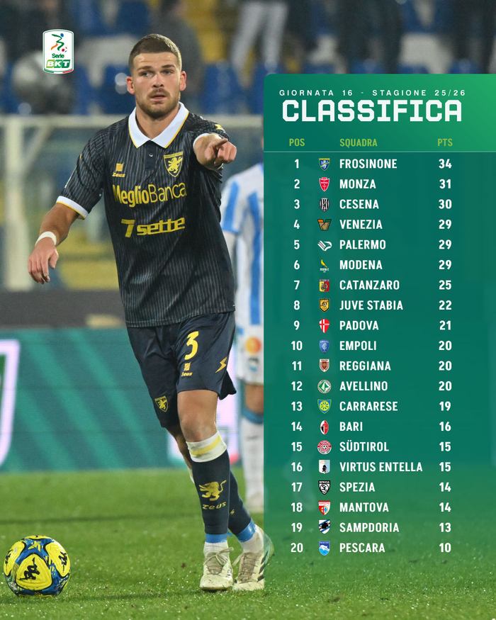 【意乙积分榜】 #意乙# 2025-26赛季意乙联赛第16轮积分榜: