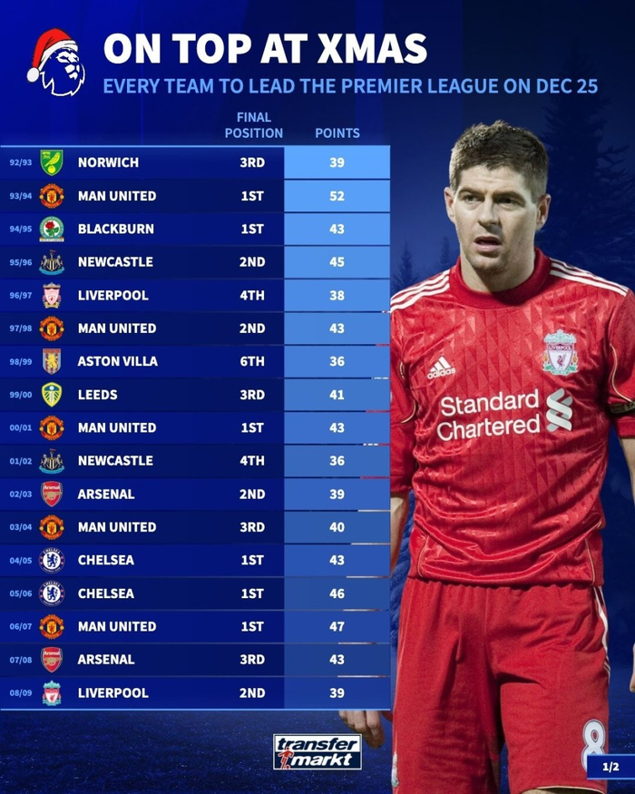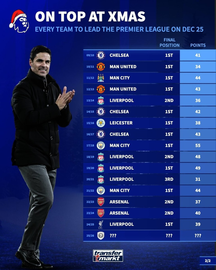 德国转会市场列出了近年圣诞期间英超榜首球队的最终排名,33支圣诞节登顶的球队,只有17支夺冠,近7年仅3队最终夺冠。