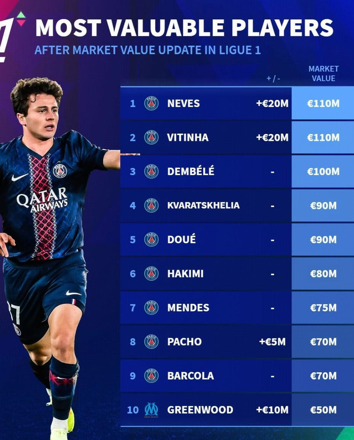 而另外的巴黎攻击手包括杜埃、克瓦拉茨赫利亚和登贝莱的身价分别是9000万到1亿欧元,分列法甲的个人身价排行榜3到5位的。除了他们阿什拉夫·哈基米、努诺·门德斯、帕乔、巴尔科拉的身价为7000万到8000万,他们分列这6到10位的。也就是说整个法甲前10名有9名是巴黎队员,由此可知,他们对这项赛事的统治的确是有根基的。