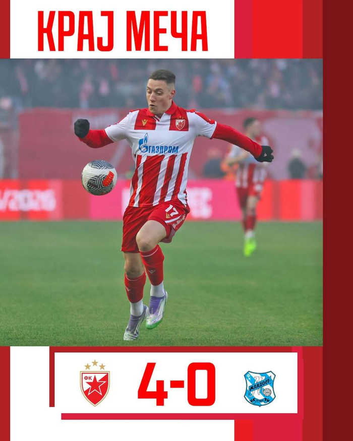 #塞尔维亚超级联赛# 贝尔格莱德红星主场4:0大胜马拉多特队,克鲁尼斯🇧🇦首发出场踢了95分钟。