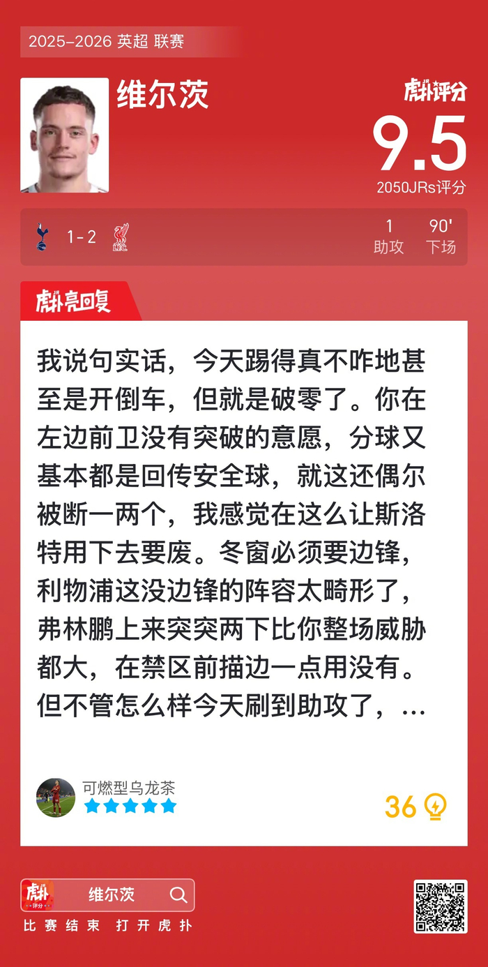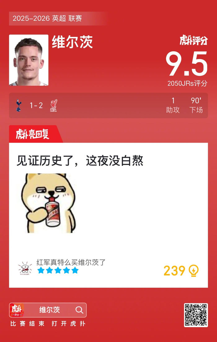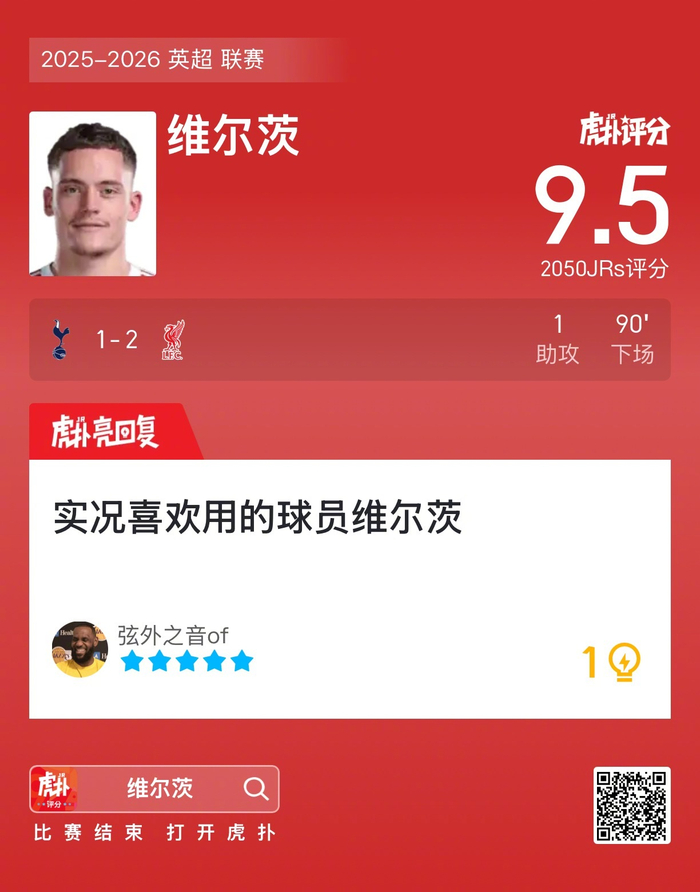#热刺1比2利物浦#维尔茨贡献一次助攻,赛后收获9.5的虎扑评分!