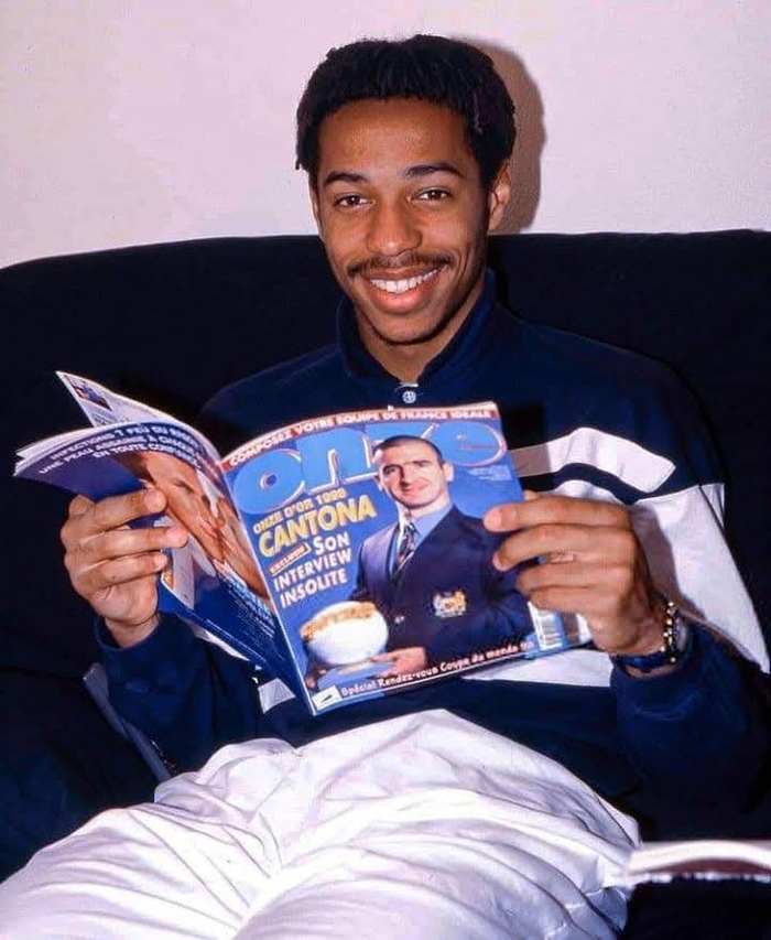【老照片】 #法国球迷俱乐部[超话]# 🇫🇷Thierry Henry reading a 1998 issue of Onze Mondial 📖