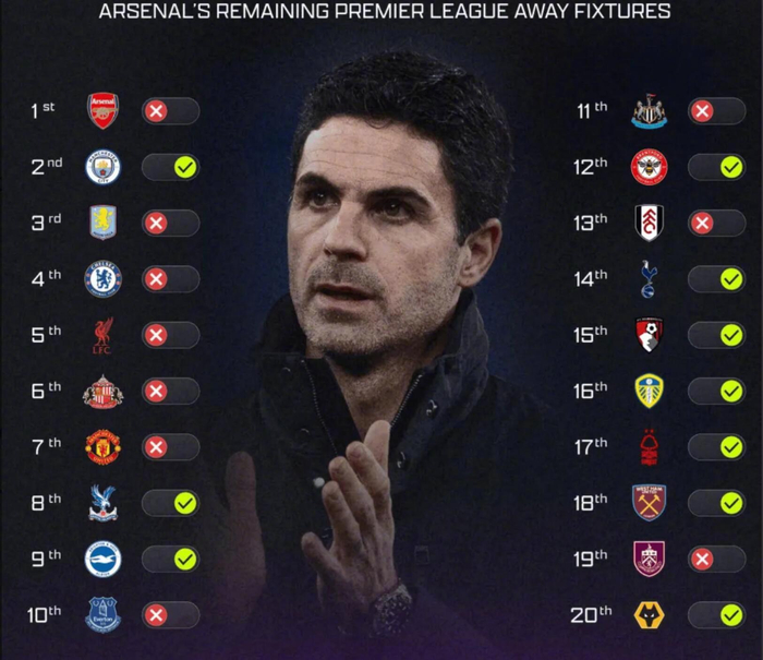 阿森纳剩余客场对手为:曼城、水晶宫、布莱顿、布伦特福德、热刺、伯恩茅斯、利兹联、诺丁汉森林、西汉姆联以及狼队。