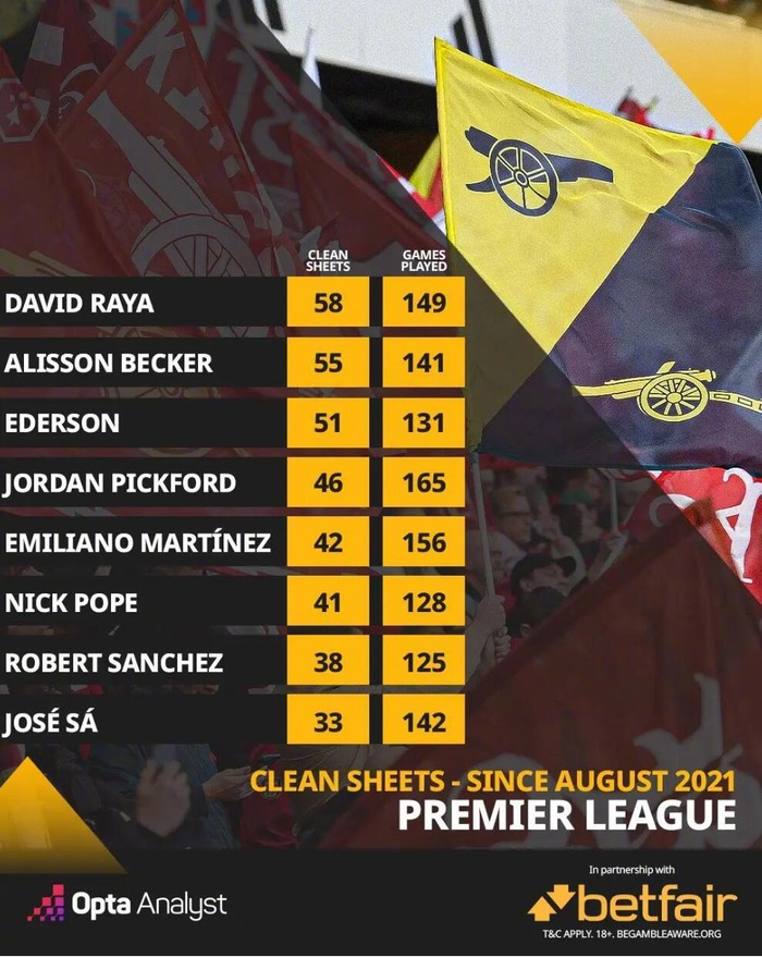 OPTA统计,阿森纳的下一场比赛将是门将大卫-拉亚在英超联赛中的第 150 场比赛。