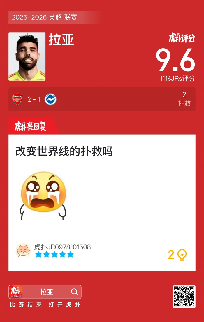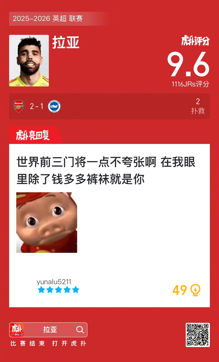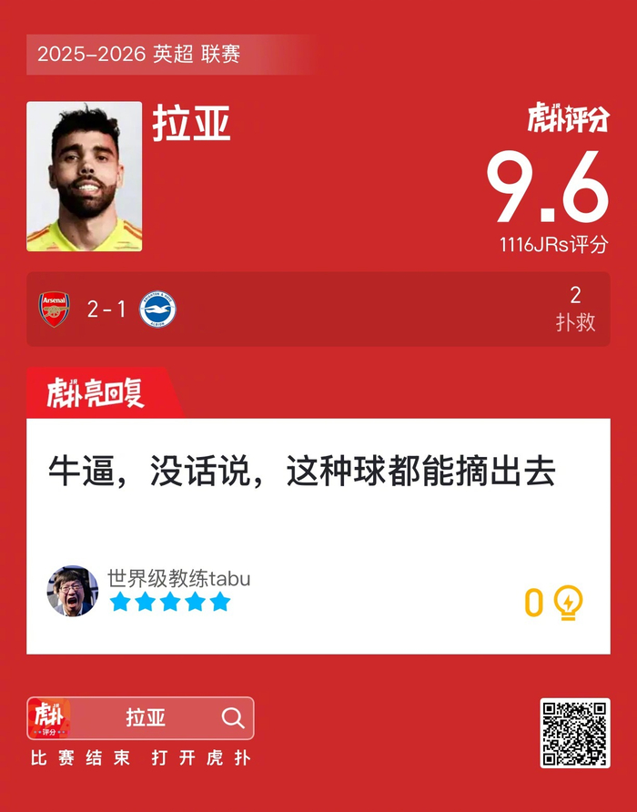 #阿森纳2比1布莱顿#拉亚贡献两次扑救,赛后收获9.6的虎扑评分!