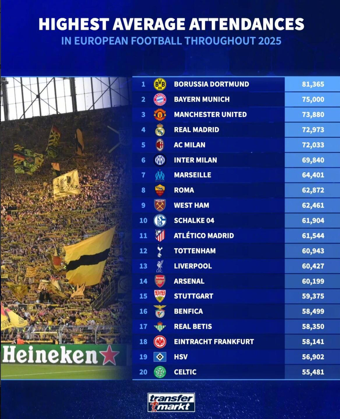 德国“转会市场”发布了2025年欧洲俱乐部场均上座人数排行榜,德甲豪门多特蒙德以绝对优势荣登榜首,拜仁慕尼黑紧随其后,曼联整个2025年虽然成绩不佳,但依然能平均每场吸引73880名观众到场看球。