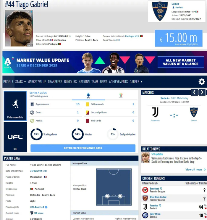 俱乐部体育总监蒂亚戈-平托,这位意甲的老炮,不仅开始关注萨索洛后卫穆哈雷莫维奇,还关注了莱切的葡萄牙中后卫蒂亚戈·加布里埃尔。
