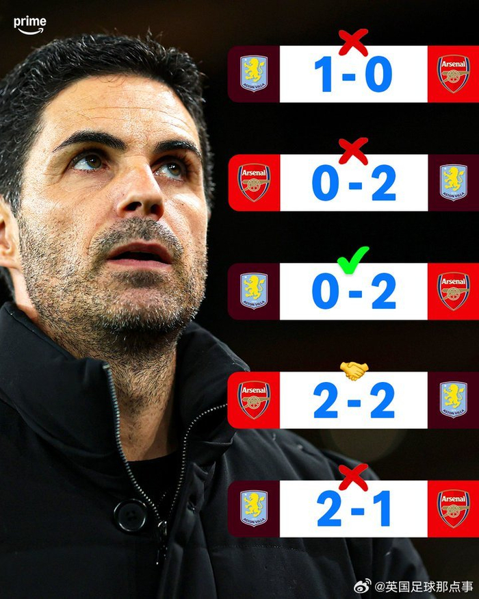 【苦主】Prime Sport:阿森纳近五场与维拉的比赛只赢了一场😬