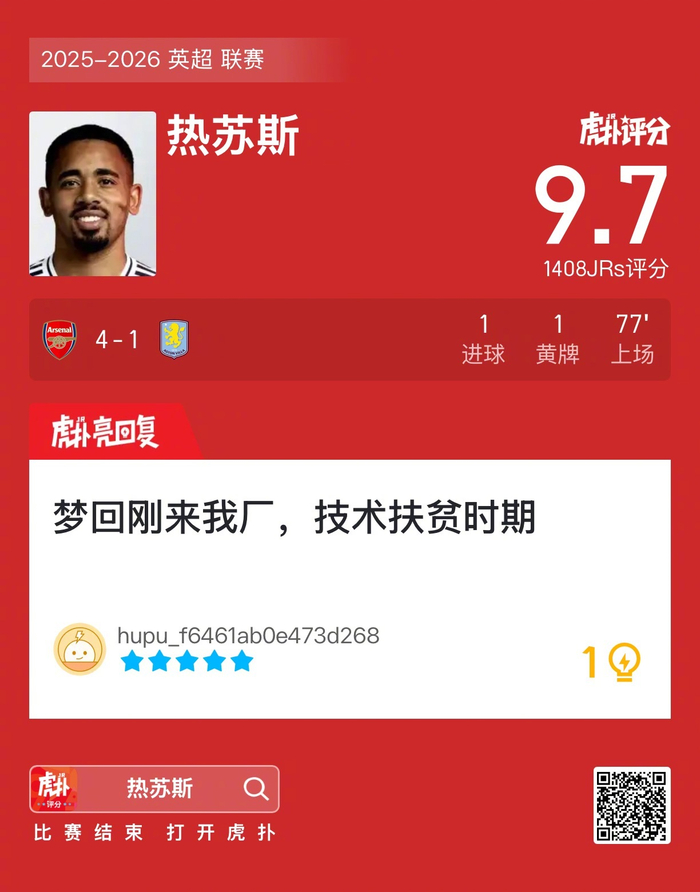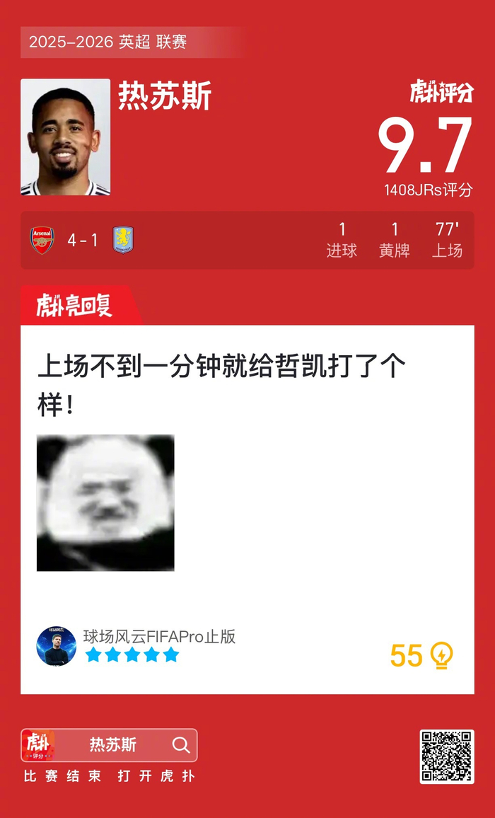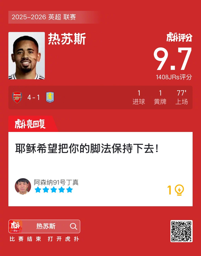 #阿森纳4比1阿斯顿维拉# 热苏斯打进一球,吃到一张黄牌,赛后收获9.7的虎扑评分!