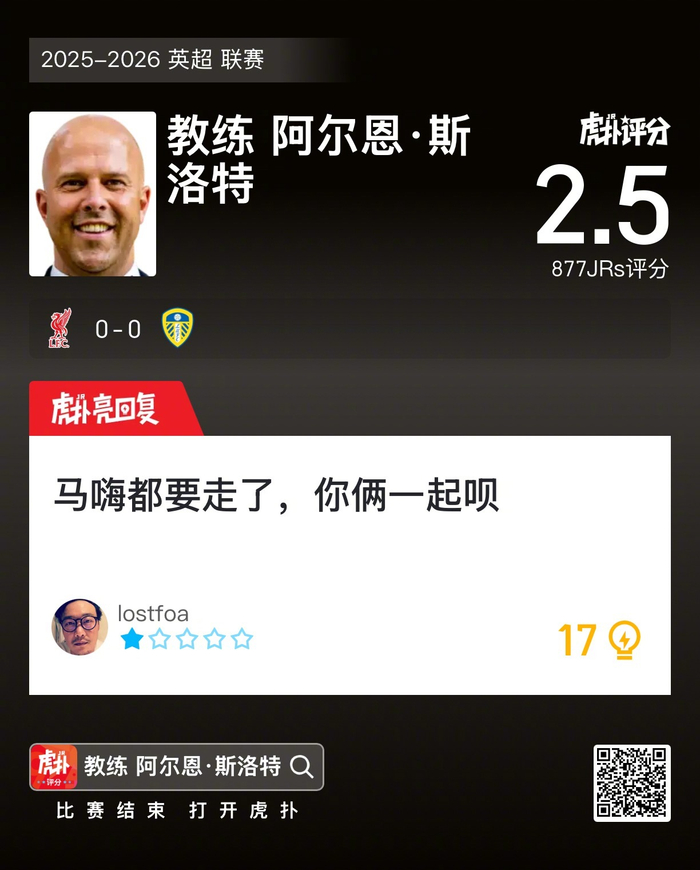 #利物浦0比0利兹联# 斯洛特赛后收获2.5的虎扑评分!