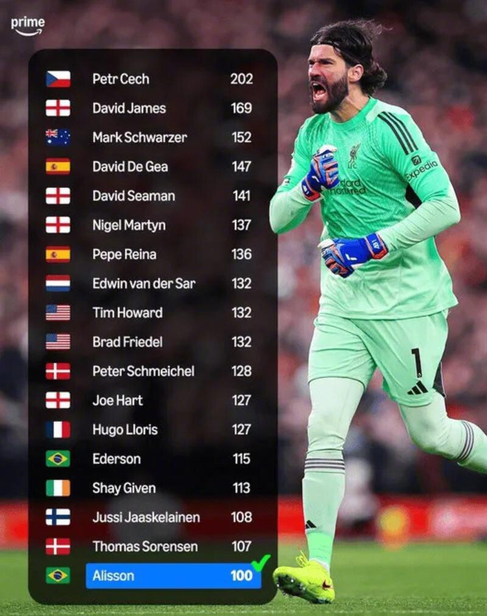 Prime发文表示,在利物浦0-0利兹联的比赛之后,红军门将阿利松加入英超联赛门将百场及以上零封榜,为第18位入选者。