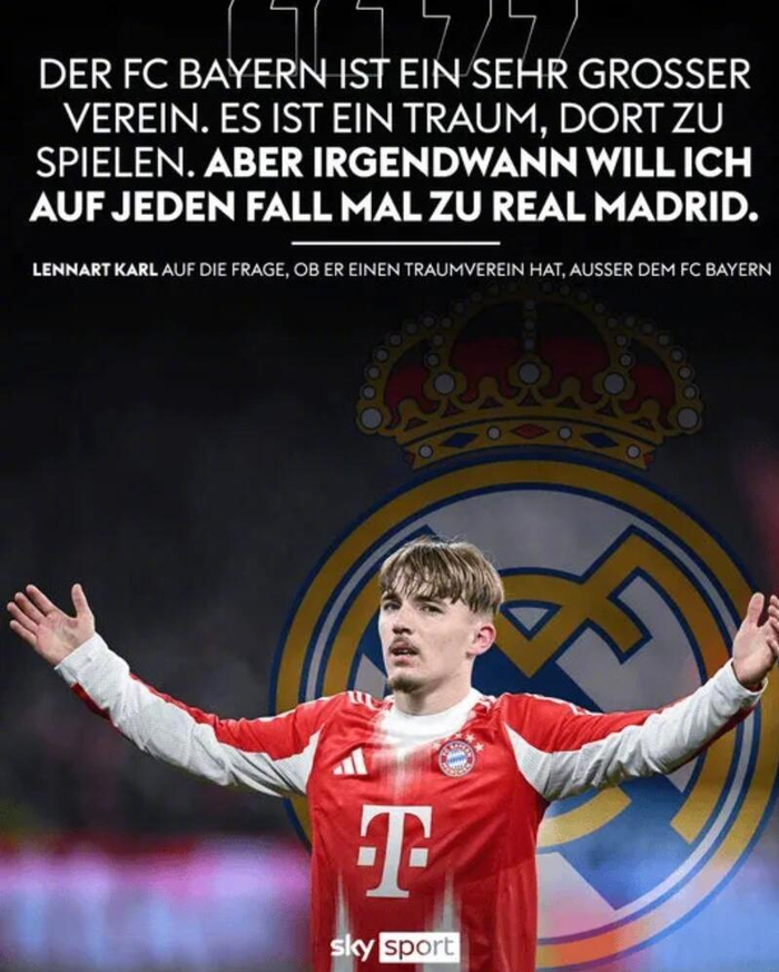 据德国天空体育消息,17岁的德国中场卡尔在出席拜仁活动时被问到未来话题,当被问及他是否还有拜仁以外的梦想俱乐部时,他表示:“拜仁是一家非常大的俱乐部。能在这里比赛简直是梦想成真。但未来总有一天我肯定想去皇家马德里踢球。”