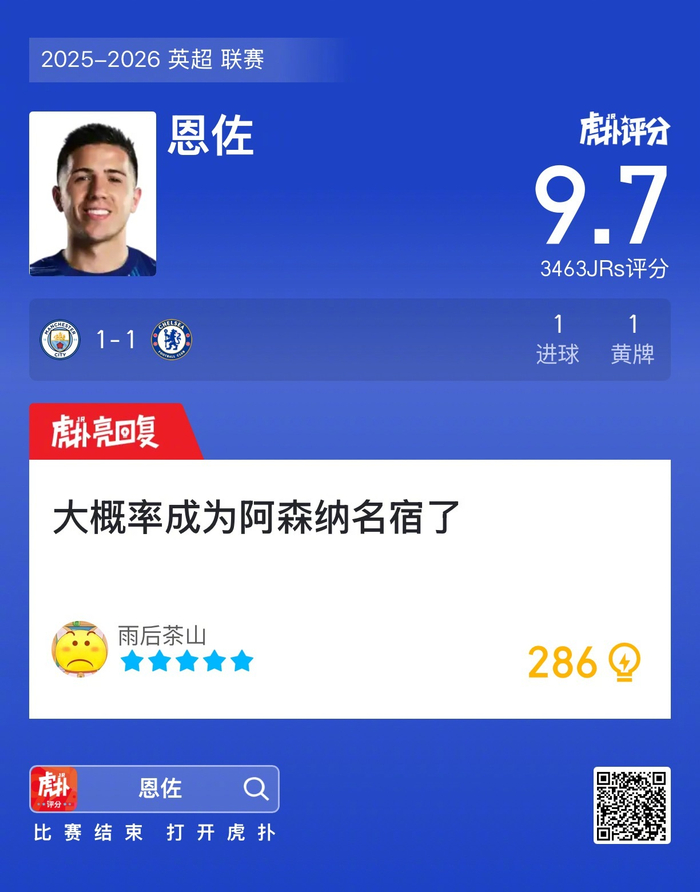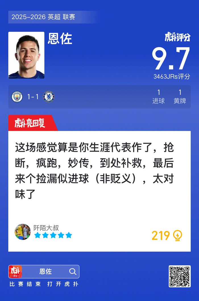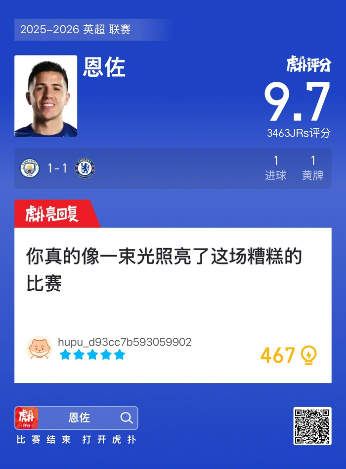 #曼城1比1切尔西#恩佐打进一球,吃到一张黄牌,赛后收获9.7的虎扑评分!