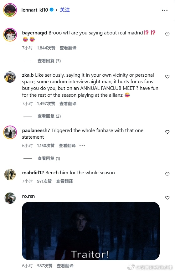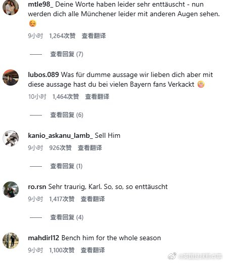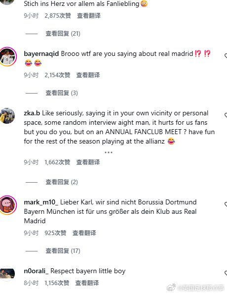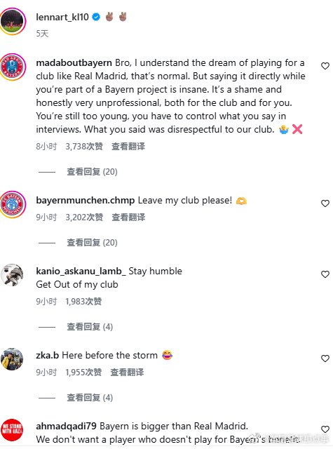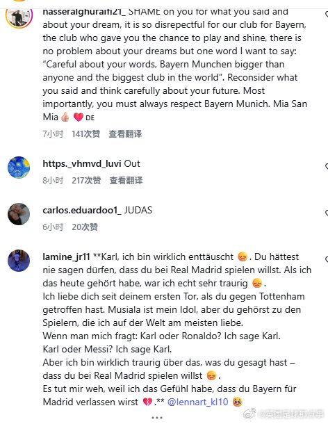 起因是他在俱乐部的年度球迷见面会上公开表示未来希望有一天能去皇马.....👀活动中被问到“除了拜仁是否还有梦想的俱乐部”这个问题时,他回答:“我希望这是我们之间的秘密,拜仁是一家很大的俱乐部,在这里踢球也是我的梦想。但未来有朝一日,我肯定希望去皇马,那是我梦想的俱乐部,这事儿大家保密吧。当然,拜仁也很特别,我在这里很开心。”以下是拜仁球迷在他最近一条社媒下的评论:兄弟,我理解你想为像皇马这样的俱乐部效力,这很正常。但你在还属于拜仁球员的时候直接说出来,这就太疯狂了,而且非常不专业,对俱乐部和你自己都不合适。你还太年轻,必须控制在采访中说的话。你说的话对我们俱乐部是及其不尊重的。请离开我的俱乐部吧!🫶拜仁比皇马更伟大。我们不需要只为自己考虑、不为拜仁利益而战的球员。滚出去,我们不需要你。穆西亚拉回来了。兄弟,你说想去皇马,这对我们球迷来说简直像一刀刺心,尤其你还是球迷最爱的球员😢说真的,要是在自己周围或者随便一个采访里说也就算了,虽然伤了我们球迷的心,但你想做你自己也行。但你居然在年度球迷见面会上说?那剩下的赛季就好好在安联球场踢吧 😂亲爱的卡尔,我们不是多特蒙德,拜仁对我们来说比你的皇马俱乐部更伟大。你说的话太愚蠢了,我们爱你,但这句话让很多拜仁球迷对你彻底失望😬**羞愧吧!**你说的话,以及你所谓的“梦想”,对我们的俱乐部——拜仁——极其不尊重。是拜仁给了你机会,让你在这里闪光。你的梦想没有问题,但我只想提醒一句:“注意你的言辞,拜仁慕尼黑比任何人都重要,是世界上最伟大的俱乐部。”请重新考虑你说的话,好好思考自己的未来。最重要的是,你必须永远尊重拜仁慕尼黑。
