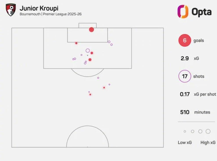 Opta数据统计,伯恩茅斯前锋克鲁皮本赛季在英超中完成17次射门,打进6球,平均每2.8次射门便攻入1球,成为本赛季联赛打进至少5球的球员中效率最高的一位。