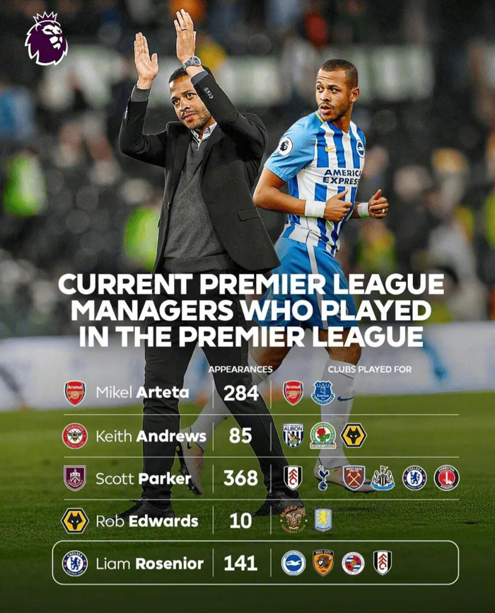 罗西尼尔接手切尔西,英超官方也统计了现任英超主教练球员时期在英超中的出场榜。