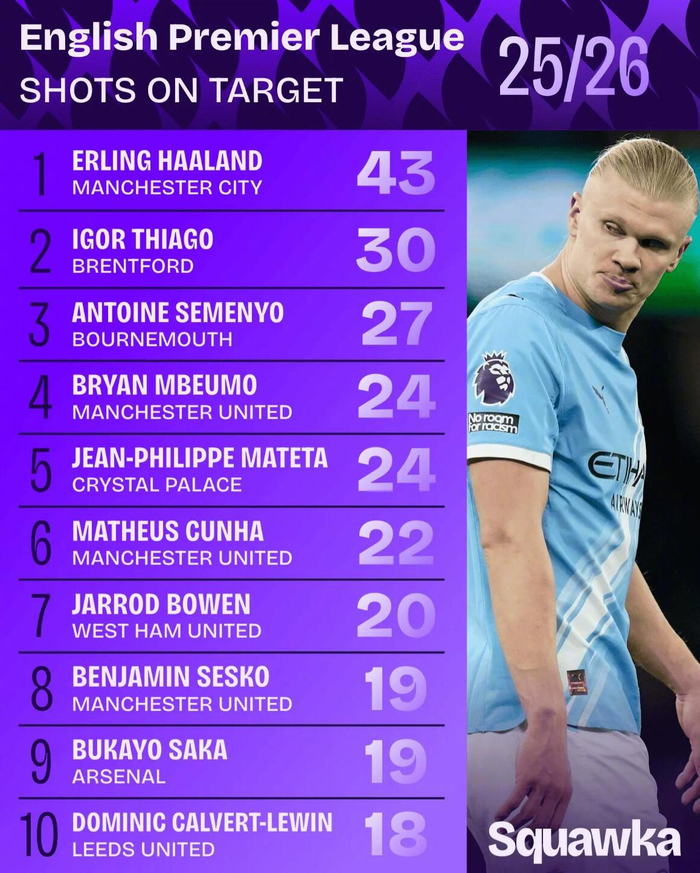 英超前21轮比赛结束,数据网站squawka统计了英超本赛季截止目前的射正榜。