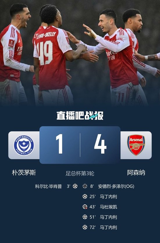 直播吧1月11日讯 北京时间1月11日22:00,英格兰足总杯第3轮,阿森纳在弗拉顿公园球场客战朴茨茅斯。上半场埃泽失误被断球,毕肖普破门,多泽尔自摆乌龙,马丁内利头球破门助阿森纳反超,随后他还有一次补射击中立柱,马杜埃凯造点,随后他自己主罚打偏,半场枪手暂2-1朴茨茅斯;下半场马丁内利双响,最终阿森纳4-1朴茨茅斯,晋级32强。