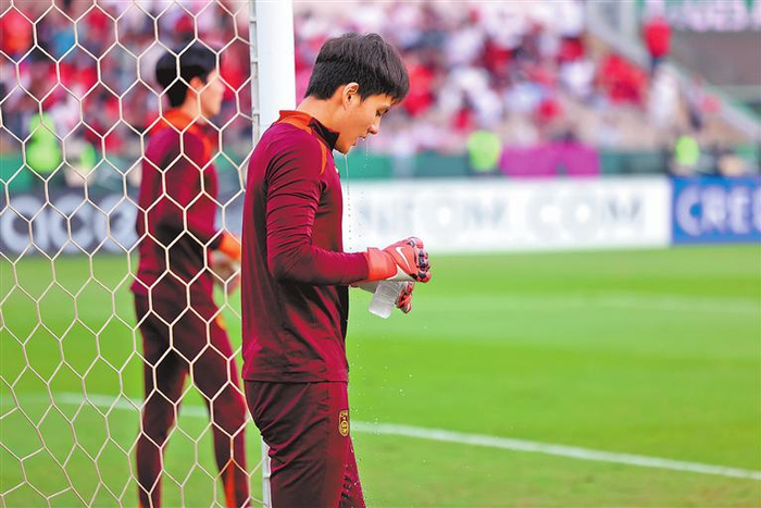 1月24日,中国队守门员李昊(前)在2026年亚足联U23男足亚洲杯决赛前热身。 新华社记者 王海洲 摄