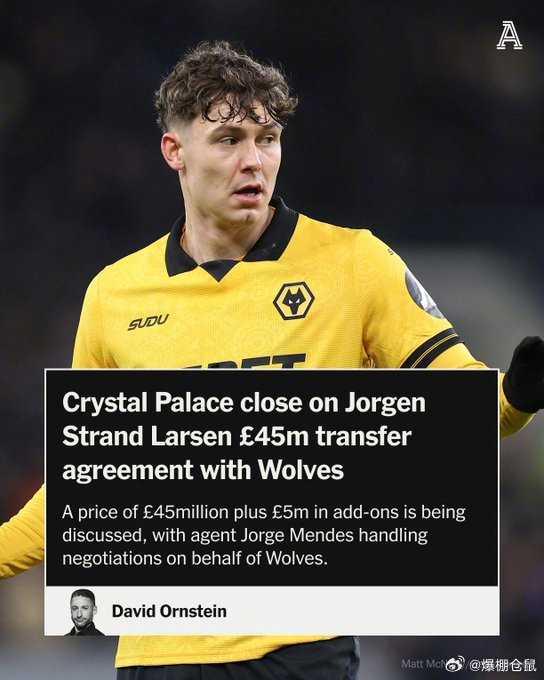 【狼队不过了】The Athletic:水晶宫和狼队就前锋尤尔根-拉森的交易接近达成口头协议,45M英镑+5M浮动条款,这名25岁的挪威前锋本赛季出场25次,贡献6球2助攻。